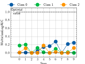 >>> # Example plotting multiple values >>> import torch >>> from torchmetrics.classification import MulticlassLogAUC >>> metric = MulticlassLogAUC(num_classes=3) >>> values = [ ] >>> for _ in range(10): ... values.append(metric(torch.randn(20, 3), torch.randint(3, (20,)))) >>> fig_, ax_ = metric.plot(values)