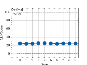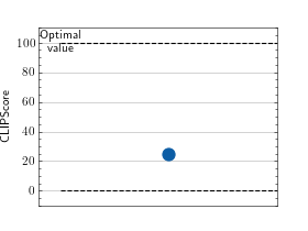 which corresponds to the cosine similarity between visual CLIP embedding \(E_i\) for an image \(i\) and textual CLIP embedding \(E_C\) for an caption \(C\). The score is bound between 0 and 100 and the closer to 100 the better.